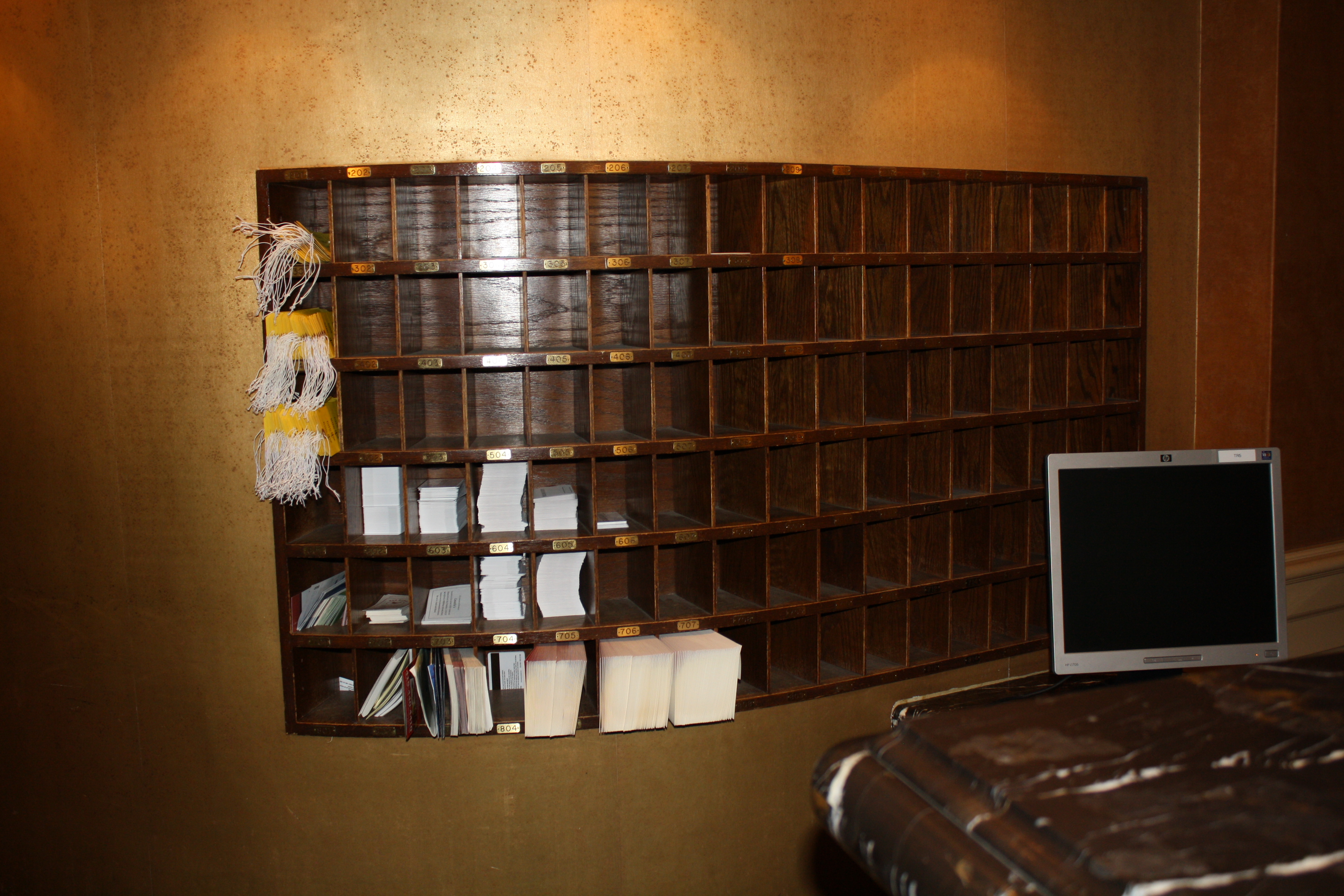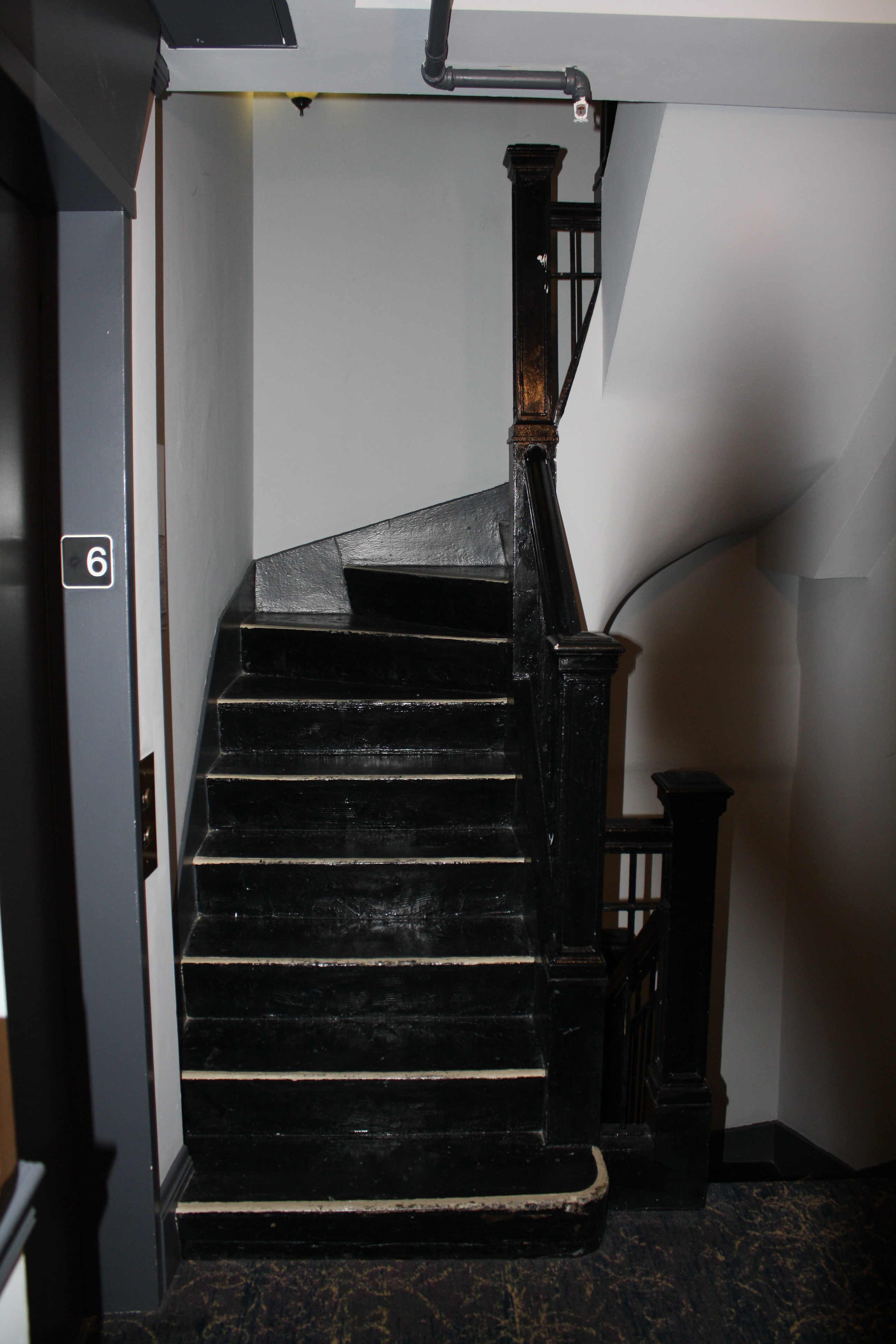 Warm and inviting with rich tones, original hardwood floors and holiday decorations make you feel at home. Just behind the reservation desk are the wooden key slots that remind you of how things use to be done. While no longer in use, it is nice to see a piece of history still on display. If you wander to the left of the desk, you will find yourself in a sitting area. Chairs, sofas and even a chess game (or two) set up around the fireplace. In the morning you can have coffee by the fire, admire the antique armoire or just sit and visit with family and friends. You can take the elevator to your room or climb the original staircase to your floor. Take your walking shoes as there are six floors.