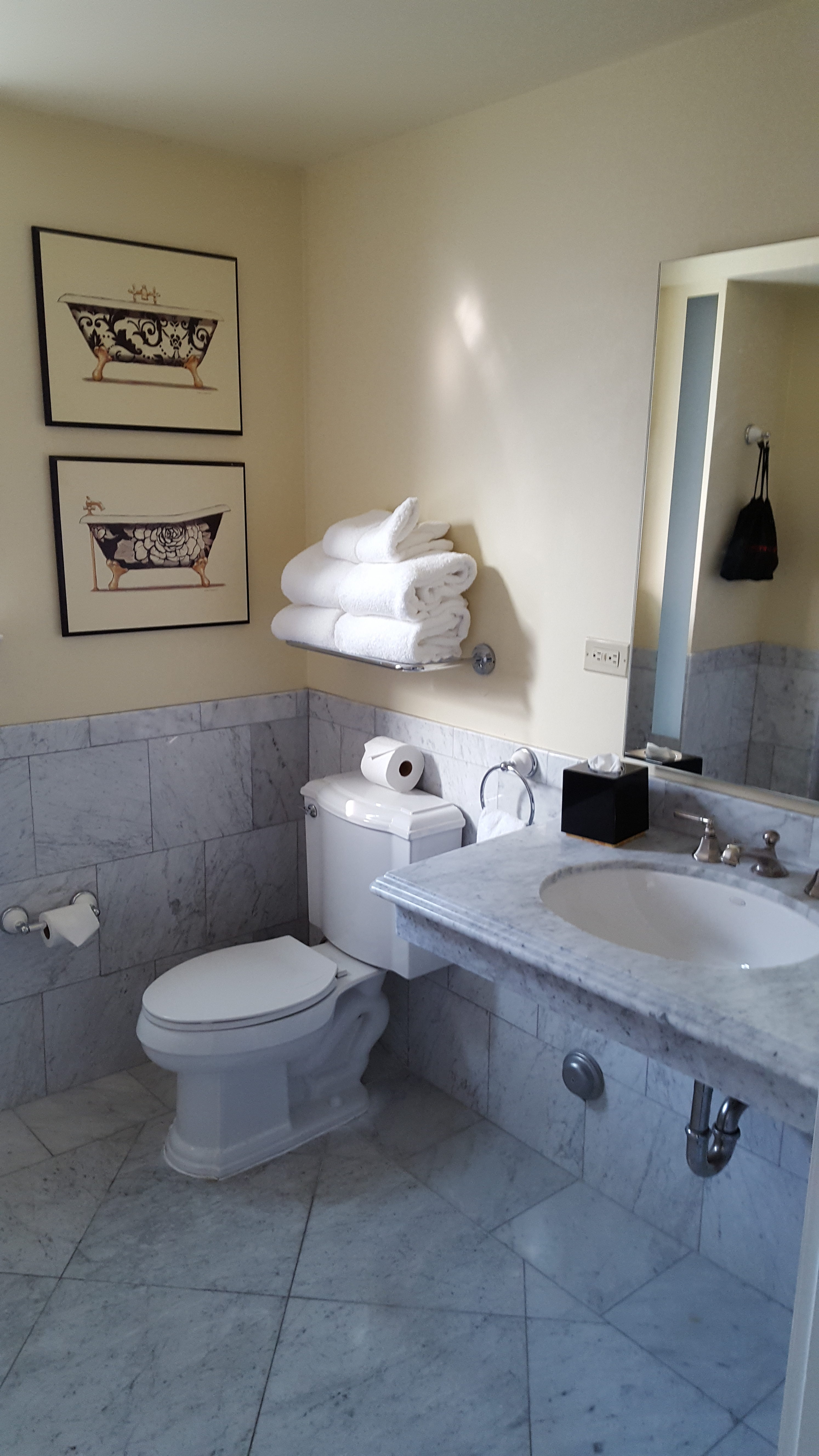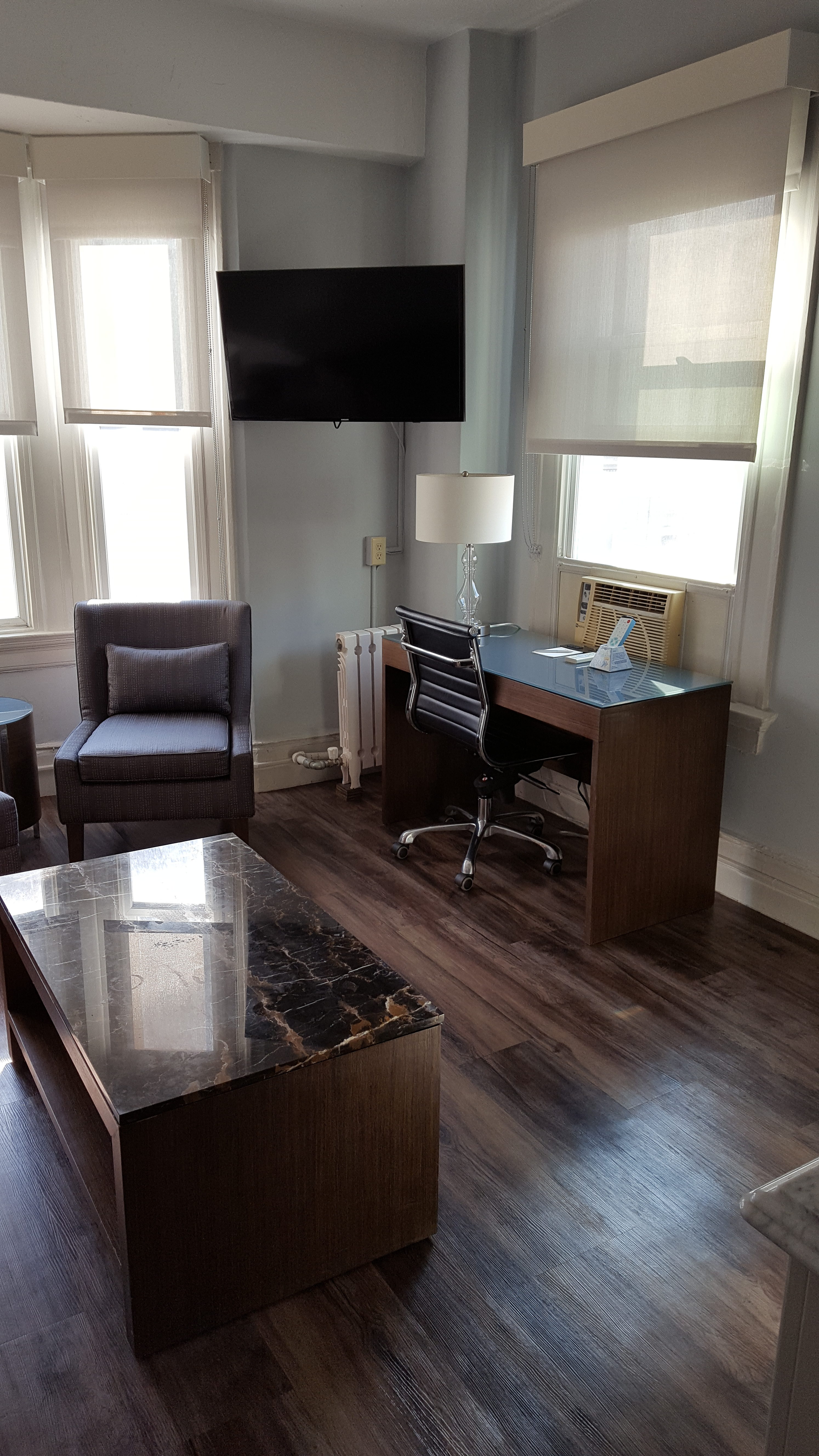 Choose a suite if available because you will want the separate sitting area. Remember this is an older hotel so the rooms are cozy and comfy! Upgraded with flat screen TV’s, marble counter-tops/floors in the bathroom and pillow top beds, you can experience some of the comforts from home. However, you will still get the unique architecture of the original rooms. The high ceilings, rounded windows and ornate detail around the ceiling will transport you back in time. You can definitely tell that The Cartwright catered to high end clientele. Right outside our room was a fire escape just like you see on TV. Steam heat and air conditioners in the windows complete the ambiance.